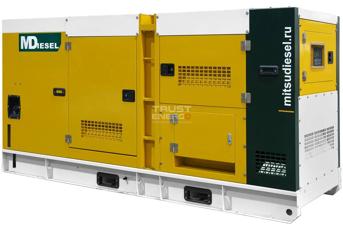Дизельный генератор MitsuDiesel МД АД-250С-Т400-1РКМ29 в шумозащитном кожухе номинальной мощностью 250 кВт с двигателем Mitsudiesel - отличный дизельный электроагрегат демонстрирующий уверенный приём нагрузки как резервный источник питания, так и основной.